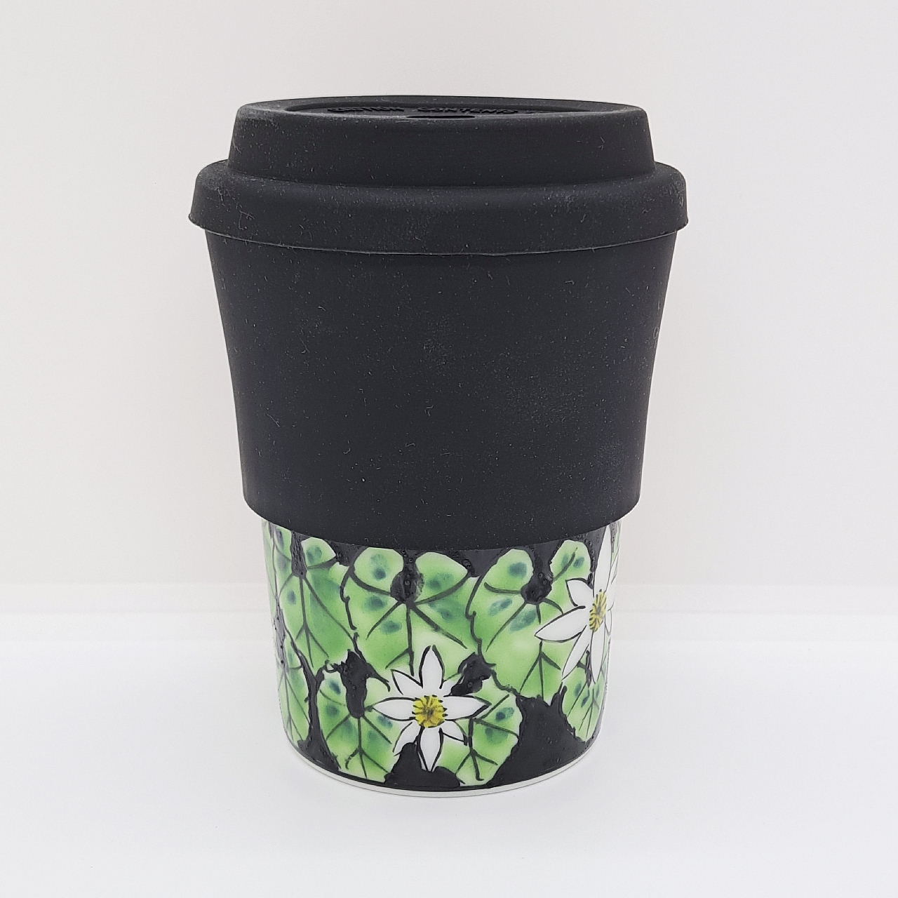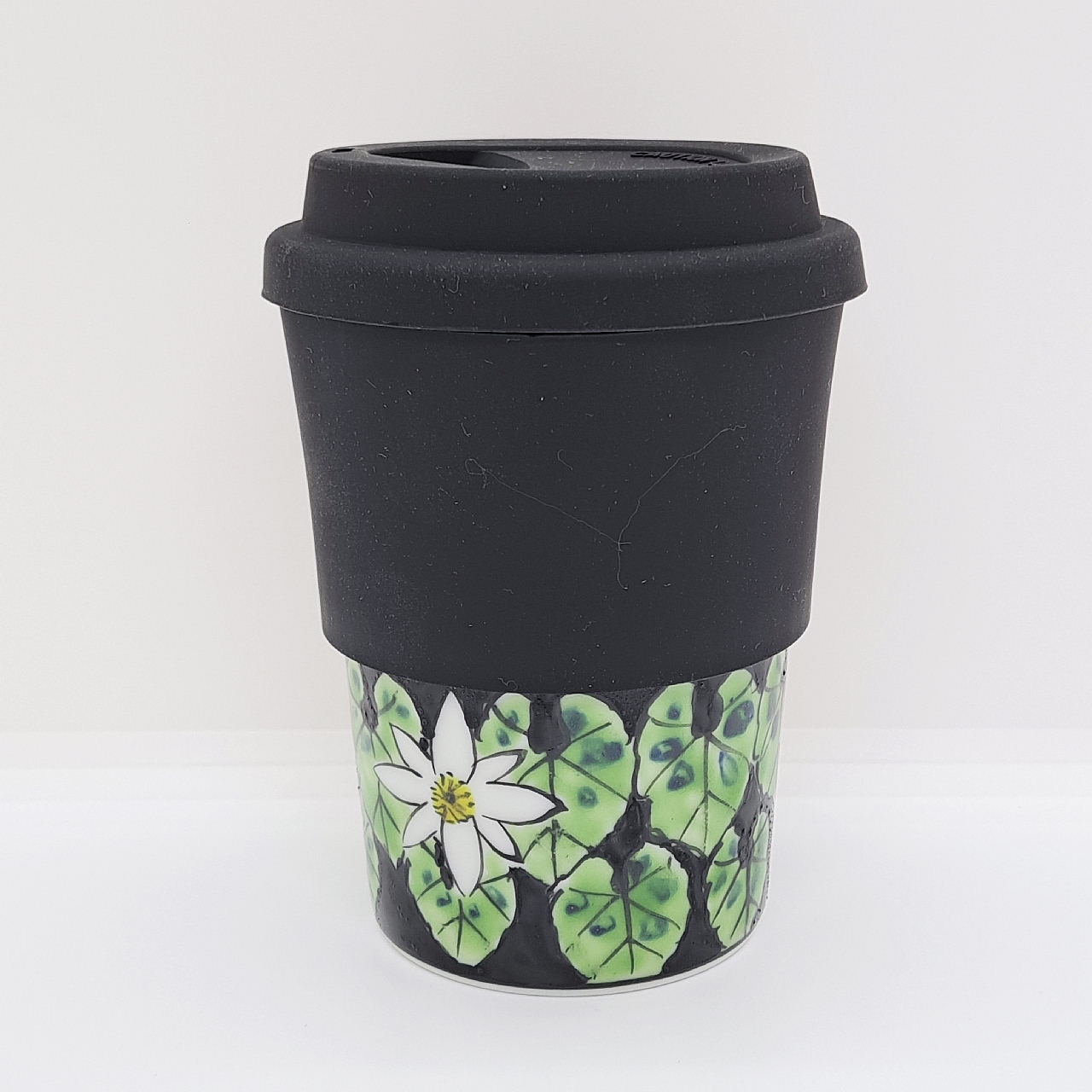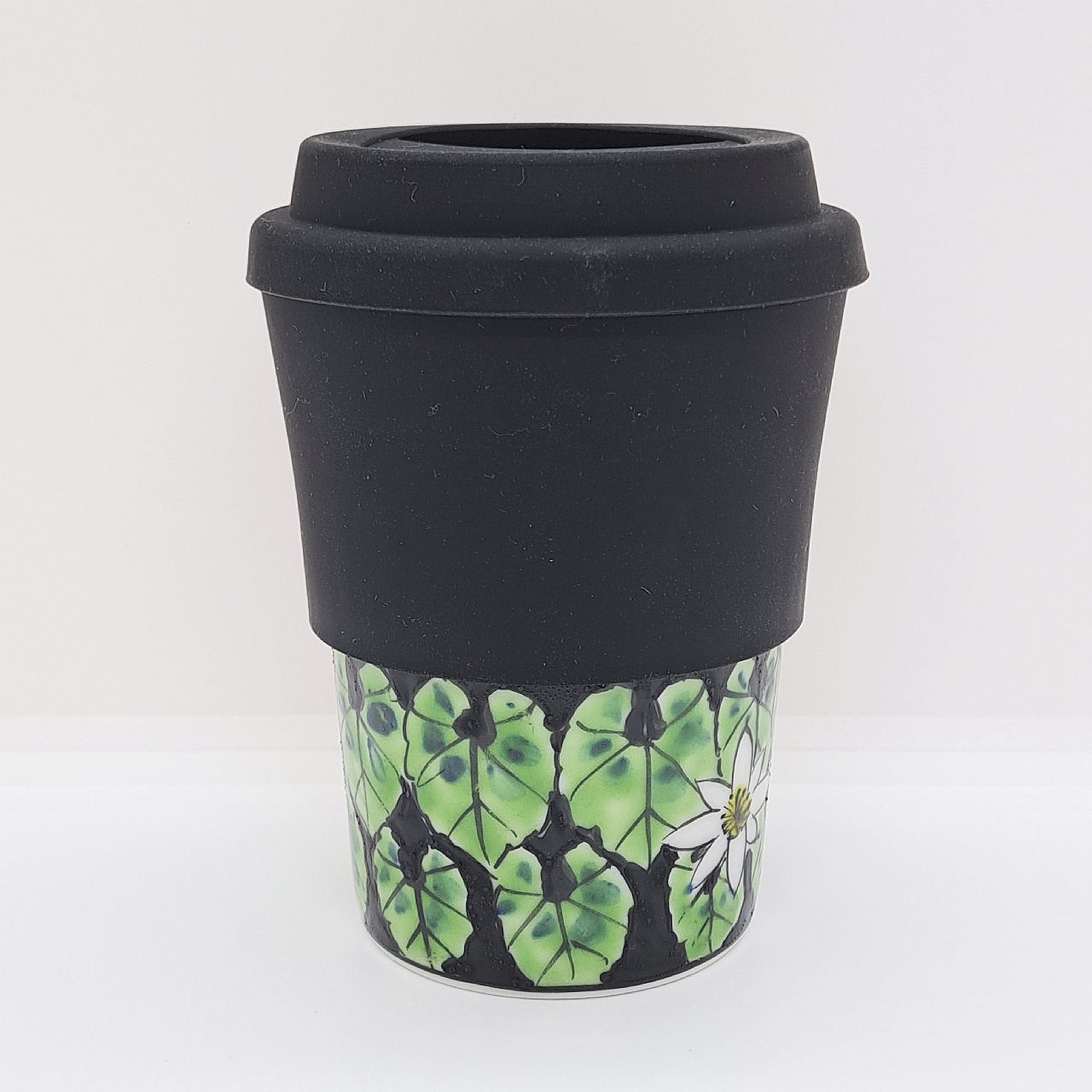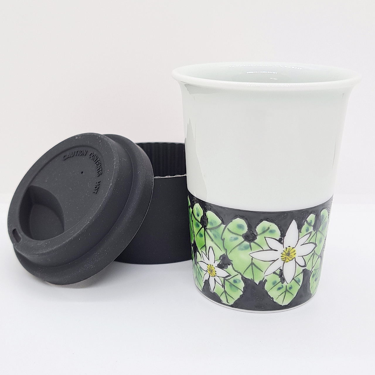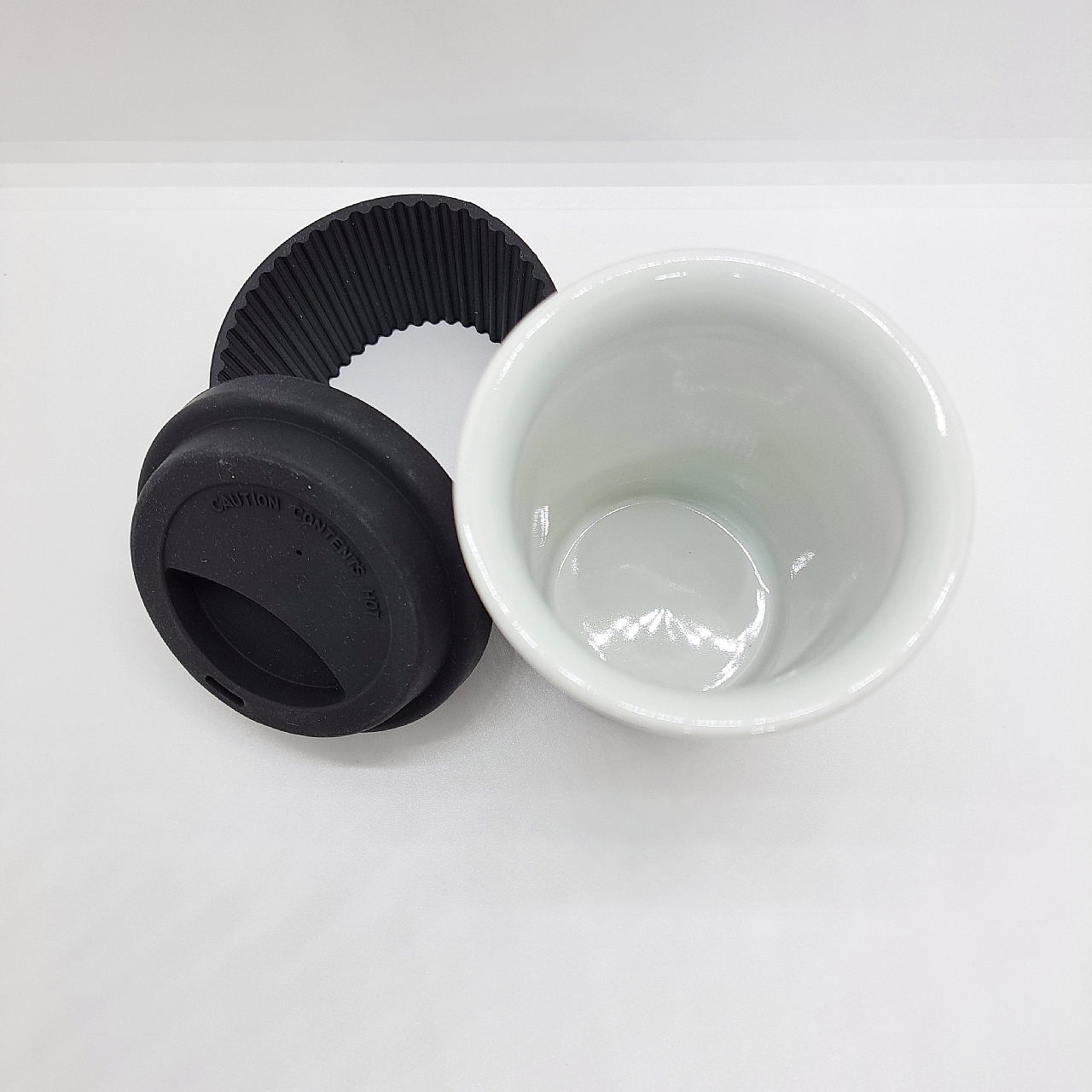 紙コップの形をした陶製カップ。蓋とスリープはシリコン製。洗って何度もお使い頂けます。