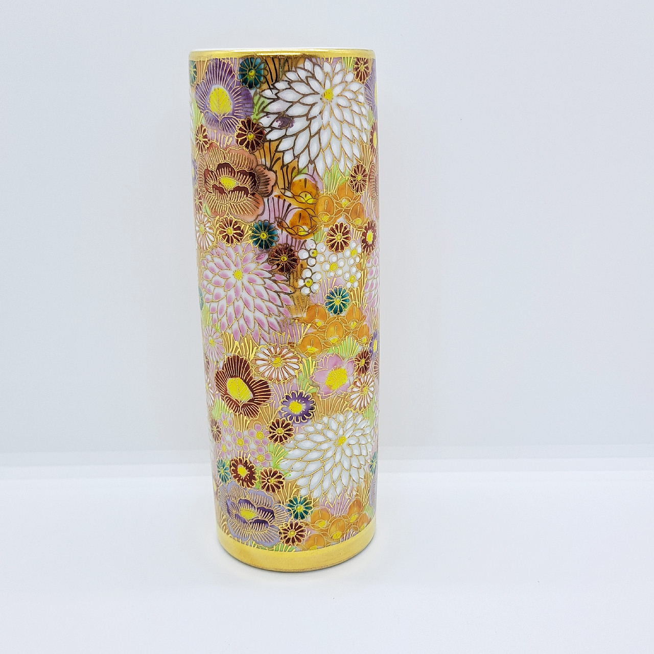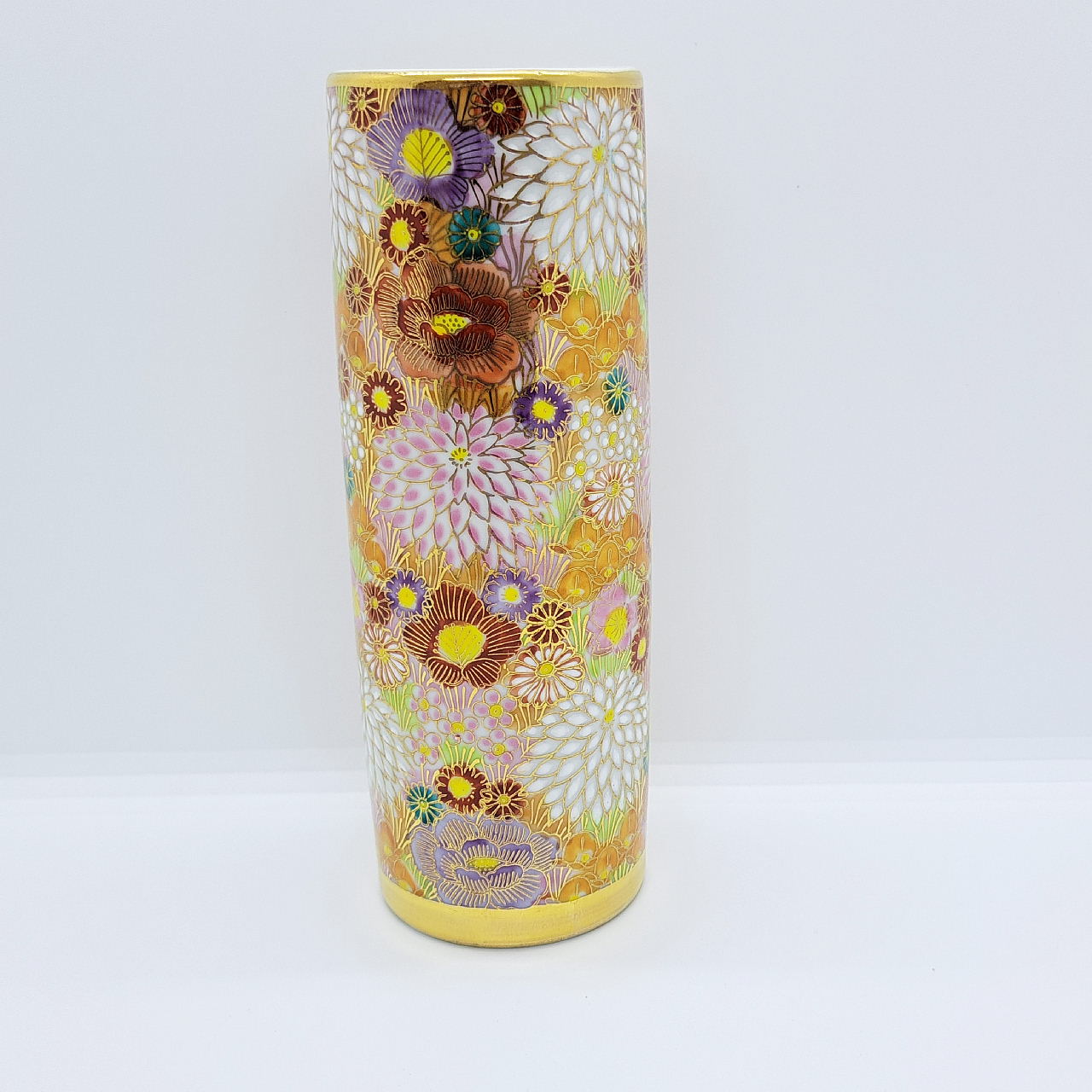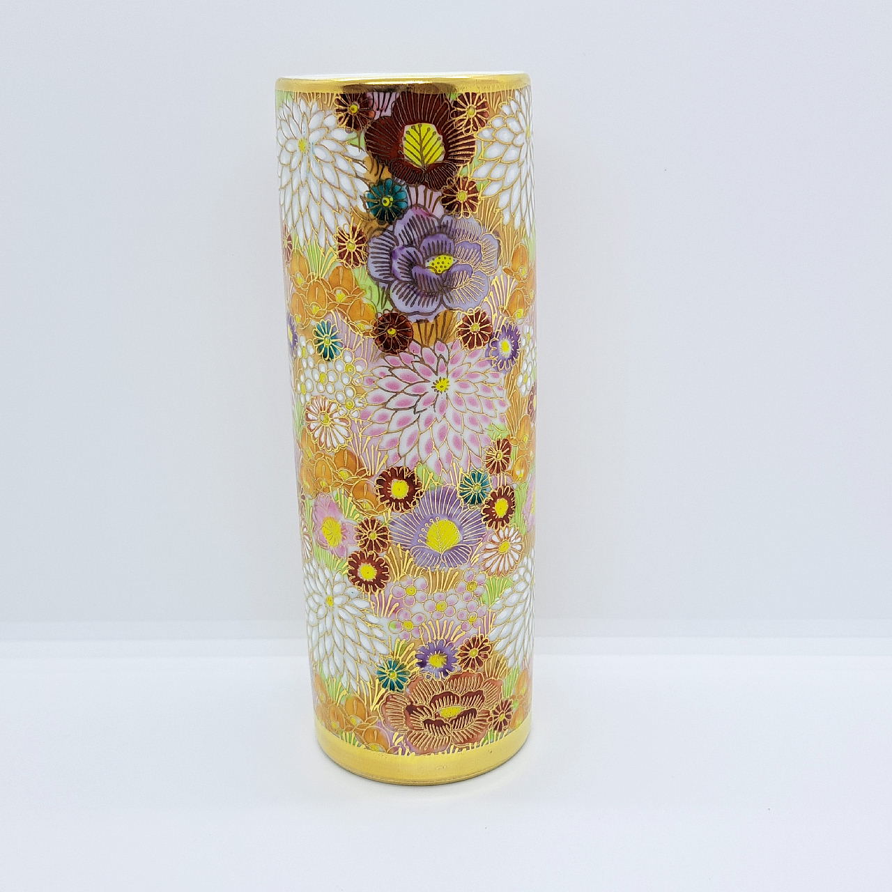 大小様々な色とりどりの花柄を敷き詰めた華やかな絵柄と金が施されているので高級感があります。